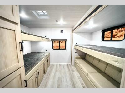Head to the RV park for a long-weekend or week-long break from your everyday routine with this trailer at your favorite campsite. After setting up the two slide outs and the 15' power awning, you can relax inside on the jack knife sofa, dine at the oversized booth dinette or whip up a meal in the L-shaped kitchen. Everyone will enjoy the fireplace no matter what you are doing. The walk-through bathroom is super convenient, and the front bedroom allows you to live like royalty in privacy. The rear bunkhouse also offers privacy and includes three bunk beds and a sofa, plus storage. Your kids or guests will love having their own room. And the exterior offers an optional outdoor kitchen, an oversized pass-through storage for your larger gear like fishing poles, outdoor tables and bags of charcoal, plus there are two spray ports to easily rinse off dirty bikes, shoes and such.