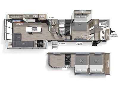 Choosing this destination trailer as your next RV won't be a hard decision! You can enter in through the front bath that includes dual bath sinks, a shower with a seat, and a medicine cabinet for your necessities. The master bedroom is connected to this bath for added convenience, and you're sure to enjoy the bedroom fireplace and king bed slide out. Just outside this room are the stairs that lead to the loft where you'll find two queen-size beds on one side and an open area where the kids can play or to use as storage. A second full bath is found next the stairs on the lower level, and there is a wardrobe with washer/dryer prep if you want to add these appliances. Everyone will love to join together and visit in the combined kitchen and living room. Here, you'll find a free-standing dinette, an L-shaped sofa, a kitchen island with two chairs, plus an entertainment center with a fireplace! The hidden pantry behind the fireplace will let you keep food stocked, and the rear patio doors will let natural light in!