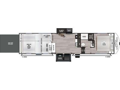 Fun at the campground begins with this toy hauler in tow! There is a 13' separate garage with a loft above for guests plus a patio deck to entertain guests. You'll also find a quick set bed system for additional sleeping space. Your crew can get comfy on the theater seating across from the fireplace, and there is an XL hidden pantry behind to keep food stocked. The two flip-up countertops with stools provides a fun place to dine since there is a window between, or you can head outdoors to enjoy some fresh air under the two power awnings. A full bath lets you freshen up after a trail ride, and the front private bedroom gives you your own space at night. This unit also features washer and dryer prep in the bedroom so you can add those appliances if you wish!