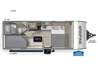 Create amazing memories in this stunning travel trailer! It is perfect for at least six people, thanks to its multiple sleeping spaces. The spacious double-sized bunk beds are ideal for kids or guests, while the plush queen-sized bed provides a restful retreat for adults. The full bathroom is equipped with everything you need for a comfortable stay, and the kitchen features a refrigerator and microwave for you to go wild in the kitchen. You can also gather around the dinette for meals and snacks, or relax in the evenings under the protection of the exterior awning. In addition, ample overhead cabinets provide storage for cookware, dishes, and essentials, keeping your trailer tidy and organized. Each one of these Forest River Cherokee Wolf Pup travel trailers and toy hauler are lightweight and easy to tow! They are fully self-contained with ample tank capacities, an abundance of storage space, and filled with at home amenities. The full bath and kitchen amenities will make life at the campground easier than ever, and the outdoor patio awning will provide an inviting outdoor space! We have 1 17LP availableView InventorySpecificationsSleeps 6 Length 23 ft 11 in Ext Width 8 ft Ext Height 10 ft 1 in Hitch Weight 435 lbs GVWR 3935 lbs Dry Weight 3104 lbs Cargo Capacity 831 lbs Fresh Water Capacity 26 gals Grey Water Capacity 28 gals Black Water Capacity 28 gals Number Of Bunks 2 Available Beds Queen Number of Awnings 1 Awning Info 12' Axle Count 1 Shower Type Tub/Shower Combo Similar Travel Trailer Floorplans