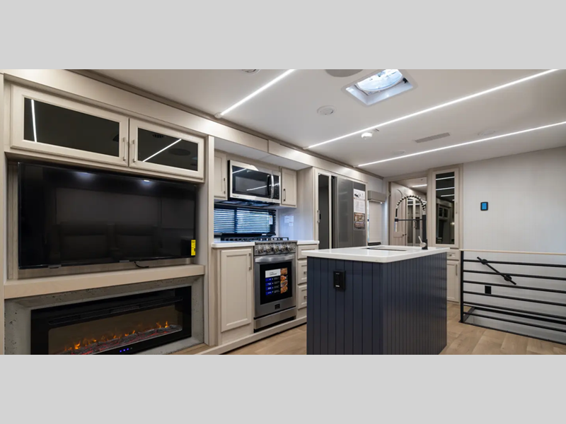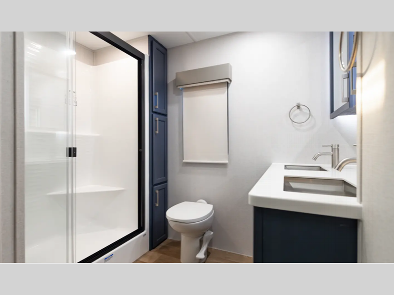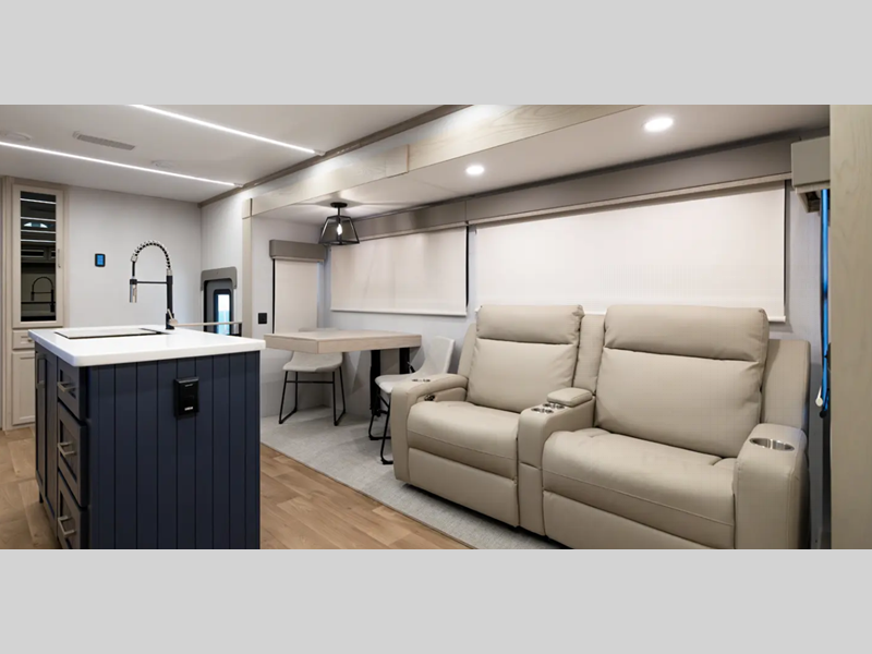 Solid construction includes an all-welded aluminum frame superstructure with vacuum bonded walls with Azdel backing, Worry Free composite floors in the basement and slide boxes, and 12V heat pads on the holding tanks. Some of the mandatory features in the packages include a 6-point hydraulic leveling system, a WiFi booster with 4G LTE capability, and a 260W solar panel. The interior provides upgraded true solid surface countertops in the bathroom and kitchen, upgraded residential hardware, and upgraded crack/mold/mildew-resistant flooring.
