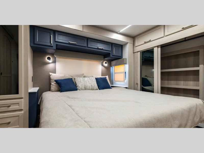 Sleeps 4 Slides 5 Ext Width 8 ft 5 in Int Height 7 ft Exterior Color Full Body Paint Pearl White and Black (required with paint option) Tire Size 16" Furnace BTU 35000 btu Available Beds King Refrigerator Type Stainless Steel 12V Refrigerator Size 18 cu ft Cooktop Burners 4 Shower Size 48" x 30" Number of Awnings 2 Axle Weight 8000 lbs LP Tank Capacity 30 lbs Water Heater Capacity 12 gal AC BTU 45000 btu TV Info LR 50" Smart TV, BR Smart TV Awning Info 19' Power w/LED Lighting Axle Count 2 Washer/Dryer Available Yes Number of LP Tanks 2 Shower Type Standard Solar Wattage 260 watts Similar Floorplans