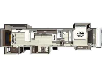 Step into luxury with this fifth wheel, where a high-end design, smart amenities, and functional living combine for an unmatched fifth wheel experience. As you enter you will find yourself in a spacious Kitchen for serious cooking: solid surface countertops, a full 18 cu. ft. french door refrigerator with ice maker, large stainless steel sink and residential-style faucet. Find yourself five slides that will create room for comfortable seating while you cozy up by the fireplace and watch your favorite movie or be as productive as you'd like with the slide out desk space. After a long day of travelling you will surely love to the front bedroom featuring a 72 x 80 king bed to finish your day with a good night's sleep.