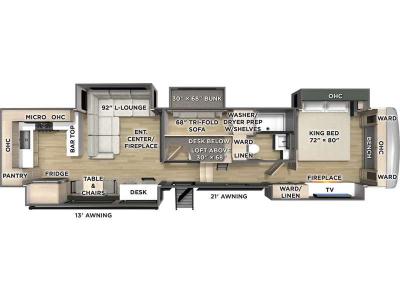 Sleeps 8 Slides 5 Length 42 ft 7 in Ext Width 8 ft 5 in Ext Height 13 ft 6 in Hitch Weight 3245 lbs GVWR 16799 lbs Dry Weight 14504 lbs Cargo Capacity 2295 lbs Fresh Water Capacity 75 gals Grey Water Capacity 78 gals Black Water Capacity 39 gals Tire Size 16" Furnace BTU 35000 btu Number Of Bunks 1 Available Beds King Refrigerator Type 12V Three Door w/Ice Refrigerator Size 18 cu ft Cooktop Burners 4 Shower Size 48" x 30" Number of Awnings 2 Axle Weight 7000 lbs LP Tank Capacity 30 lbs Water Heater Capacity 12 gal Water Heater Type Quick Recovery AC BTU 30000 btu TV Info LR 50" Smart TV, BR Smart TV Awning Info 13' 6" and 21' Power with LED Lights Axle Count 2 Washer/Dryer Available Yes Number of LP Tanks 2 Shower Type Shower w/Seat Electrical Service 50 amp Similar Fifth Wheel Floorplans
