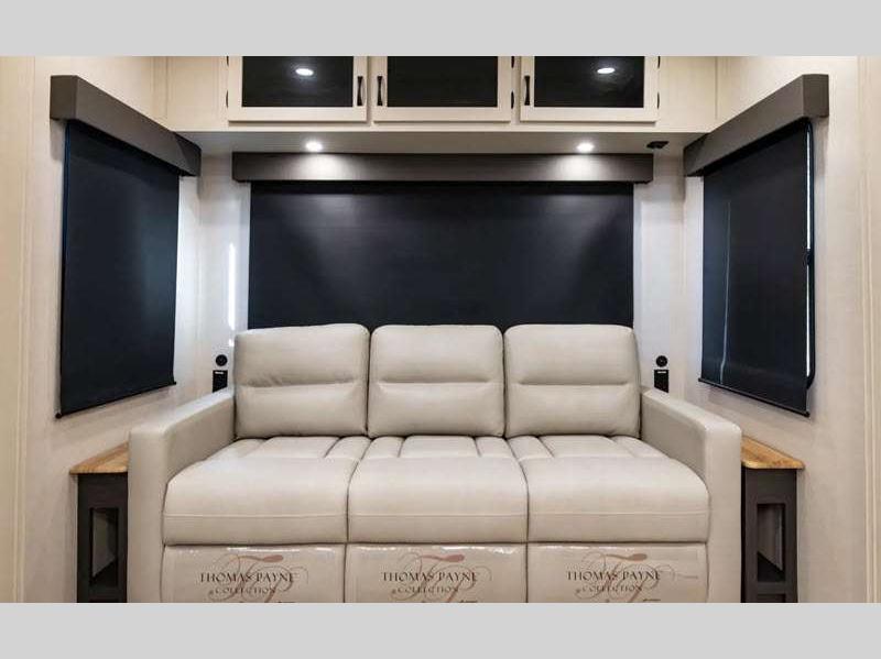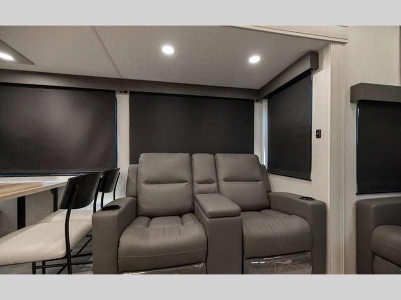 Sleeps 8 Slides 3 Length 42 ft 6 in Ext Width 8 ft Ext Height 13 ft Interior Color Shimmer, Slate Hitch Weight 2040 lbs GVWR 14500 lbs Dry Weight 12185 lbs Cargo Capacity 2315 lbs Fresh Water Capacity 48 gals Grey Water Capacity 112 gals Black Water Capacity 75 gals Tire Size 16" Available Beds Queen, King Refrigerator Type Side by Side Stainless Glass 12V Refrigerator Size 16 cu ft Cooktop Burners 3 Number of Awnings 1 Water Heater Type On Demand AC BTU 27000 btu TV Info LR 50" 4K Smart LED TV Awning Info 24' Electric w/LED Light Strip & One Hand Pitch Adjustment Axle Count 2 Shower Type Shower w/Seat Electrical Service 50 amp Similar Floorplans