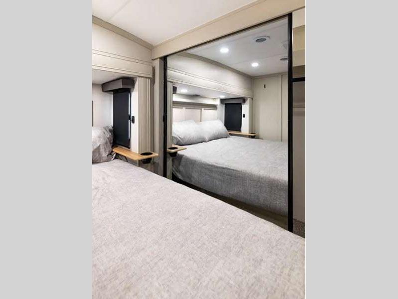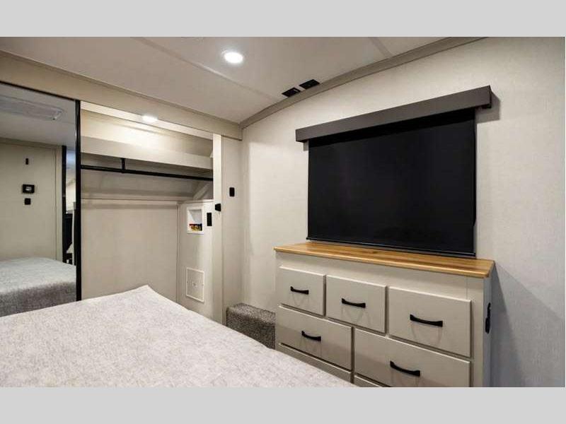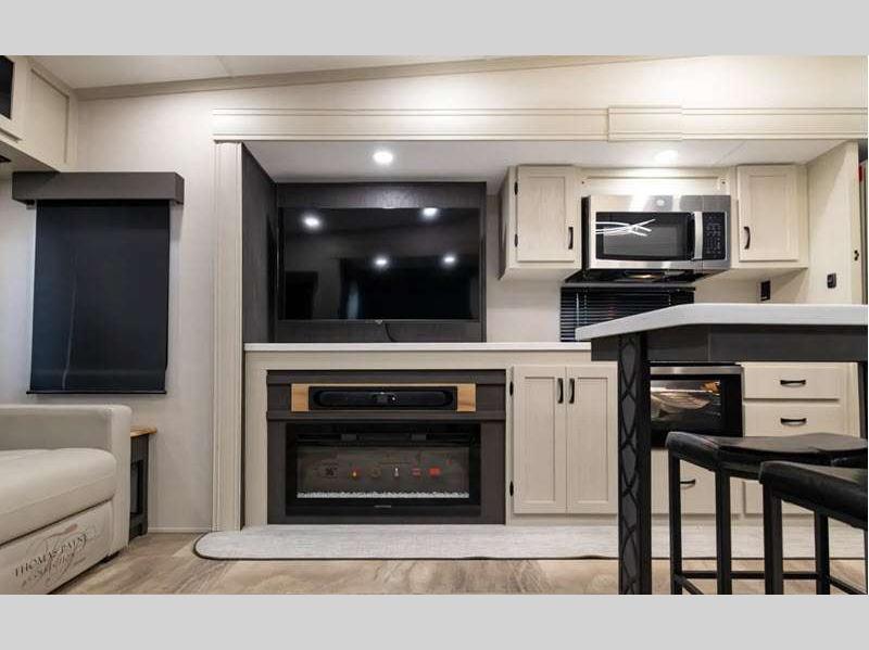 Sleeps 7 Slides 4 Interior Color Shimmer, Slate Tire Size 16" Number Of Bunks 1 Available Beds King, Trundle Refrigerator Type Side by Side Stainless Glass 12V Refrigerator Size 16 cu ft Cooktop Burners 3 Shower Size 30" x 48" Number of Awnings 1 Water Heater Type On Demand AC BTU 27000 btu TV Info LR 50" 4K Smart LED TV Awning Info 20' Electric w/LED Light Strip & One Hand Pitch Adjustment Axle Count 2 Shower Type Shower w/Seat Electrical Service 50 amp Similar Floorplans